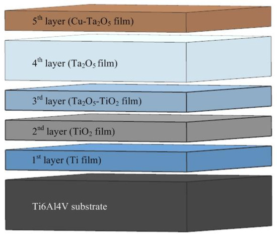 Figure 1 depicts the structures of the Cu-MTa2O5 coating. As shown in Figure 1, the Cu-MTa2O5coating contains five layers of film, wherein the first to third layers are a Ti film, TiO2 film, and TiO2-Ta2O5 composite film, respectively. These three films serve as the interlayer, in which elements of adjacent layers penetrate each other in reducing the interface stress and enhance the bonding property of the coating. The fourth layer of the Ta2O5 ceramic film is an anticorrosion layer, and the fifth layer (outer layer) is Ta2O5 doped with Cu, which has an antibacterial effect.