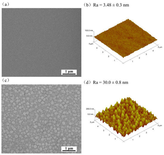 The surface topographies of the coated Ti6Al4V samples are displayed in Figure 2. The surface of the Ta2O5 coating was flat, smooth, and the grain size was uniform (Figure 2a). In contrast, the grain of the Cu-Ta2O5 coating surface (Figure 2c) is larger (10–100 nm), with clear grain boundariesand larger grain gaps, indicating the lower compactness of the outer layer. The increase in the grain size of the Cu-MTa2O5 coating relates to the doping amount of Cu [57]. Three-dimensional AFM topographies with an area of 5 μm × 5 μm showed that the main features of both coating surfaces were characterized by peak-type particles (Figure 2b,d). The particles size of Ta2O5 coating was small, with an average roughness Ra value of 3.48 ± 0.3 nm, while the roughness of the Cu-MTa2O5 coating was 30 ± 0.8 nm. A low element doping amount in the coating can increase the compactness of the coating and reduce the surface roughness, while a high doping amount increases the surface roughness [58].