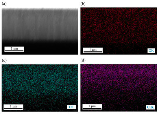Figure 3 shows the EDS analysis results of the surface Cu-MTa2O5 coating. As shown in Figure 3a–d, O, Ti, Ta, and Cu were uniformly distributed on the coating surface, indicating that the copper element was incorporated into the Ta2O5 film and the Ti element diffused to the outer layer of the coating. It can be seen from Figure 3d that the atomic percentages of O, Ti, Ta, and Cu in the Cu-MTa2O5 coatings were about 36.26%, 16.53%, 28.46%, and 18.764%, respectively. The element content in the coating mainly connects with the preparation parameters such as sputtering power, oxygen flow rate, and ratio of oxygen to argon.