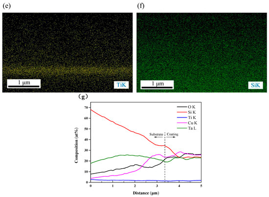 Cross-sectional SEM and EDS measurement of the Cu-MTa2O5 coating on the Si substrate: (a) SEM, (b–f) EDS mapping and (g) EDS line scan profile along with the thickness of the coated sample.