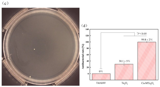 Petri dishes showing live S. aureus after being cultured at 37 °C for 24 h in LB agar containing: (a) Ti6Al4V, (b) Ta2O5 coating, and (c) Cu-MTa2O5 coating. (d) Antibacterial rates of Ti6Al4V, Ta2O5, and Cu-MTa2O5 coating against S. aureus.