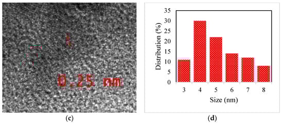 TEM images of the N–CDs in different magnifications (a,b), high-resolution (HR)TEM image (c) and the histogram showing the distribution particle size (d).