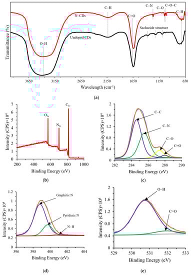 (a) FTIR analysis of undoped (black line) and N–CDs (red line), (b) X-ray photoelectron spectrum (XPS) of N–CDs, (c) high-resolution XPS for C1s, (d) high-resolution XPS spectra for N1s and (e) high-resolution XPS spectra for O1s.