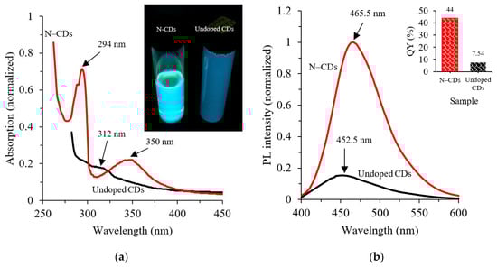 The UV-vis absorption spectra of the undoped CDs and N–CDs are presented in Figure 3a. It is shown that both curves exhibited long absorption edge in both UV and visible region (300–600 nm) without any noticeable sharp absorption peaks, as mostly observed in CDs [63]. A typical absorption peak at 294 nm was observed in N–CDs, which was assigned to the π-π* transition of sp2-hybridized carbon core (C–C) [63]. Besides that, peaks were observed at 312 and 350 nm in undoped CDs and N–CDs, respectively, which may have been attributed to n-π* of non-conjugated electron orbitals, originated from the oxygen functionalization (C=O) bonds and amino groups at the surface (in case of N–CDs) similar to previous studies [21].