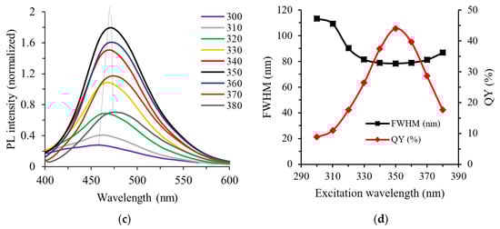 Figure 3d shows the full width at half maximum (FWHM) of the emission spectra as a function of excitation wavelength. A slight change of excitation wavelength in the range of 320–380 nm were observed with a minimum FWHM of 78.3 nm at λex = 350 nm. Meanwhile, a gradual increase in the FWHM could be seen when the excitation value was lower than 320 nm. This suggested the suitability of using these nanomaterials in broad range of analytical applications [66]. Moreover, Figure 3d shows that PL QY was highly dependent on the excitation wavelength. Specifically, the rise in the QY occurred with the increase of excitation wavelength, reaching the maximum of ~44% at 350 nm excitation. However, further increase of excitation wavelength had a negative effect on the fluorescence QY. Comparing the dependence of QY and FWHM indicated a trade-off between QY and FWHM. There was a similarity between the peak of absorption and excitation wavelength, which corresponded to the maximum intensity of emission at 350 nm. This similarity demonstrated that non-emitting absorption arised in N–CDs. The N–CDs had a large Stokes shift of around 115.5 nm, which is an advantage for bio-imaging applications [3].