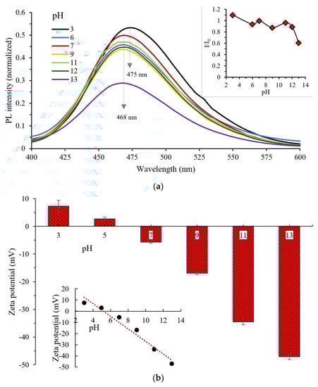 The pH mechanism of N–CDs was further evaluated by zeta potentials () study. Based on the results shown in Figure 5b, potential changes from 7 mV to −47 mV with the increase of pH value from 3 to 13. A linear relationship (inset of Figure 5b) between potential and pH (3–13) could be expressed as = −5.6436pH + 29.432 (R2 = 0.9654). The high potential confirmed the reversible protonation and deprotonation of the reactive containing groups, especially –NH and –COOH, on the surface of N–CDs which facilitated the negatively-charged zeta. As a result, the electrostatic interactions between the N–CDs and negatively-charged surface could prevent the aggregation of the N–CDs and hence stabilize them [71]. potential measurement indicated that the obtained N–CDs had an isoelectric point at pH 5.7. The overall results of potential study support very well the data obtained from FTIR and XPS analysis. It is worth mentioning that the potential of the aqueous N–CDs of the present work (−47 mV) was higher than that of the CDs obtained using different passivation agents such as xylan/NH4OH (−4.26 mV) [72] and S–CDs from thiomalic acid/H2SO4 (−42 mV) [73]. This indicated the highly negatively-charged groups presented over the N–CDs surface which imparted higher stability and dispersibility.