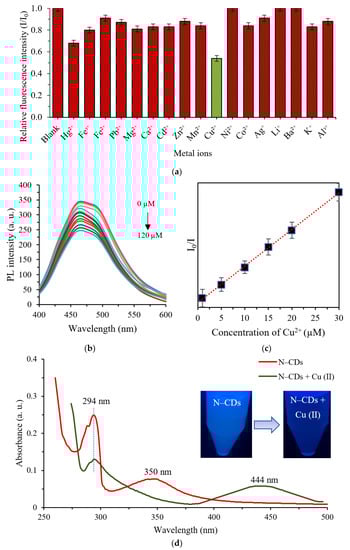 FTIR and XPS studies confirmed the existence of oxygen/nitrogen-containing groups over the N–CDs surface. These groups have good affinity to interact with metal ions by forming coordination bonds, in which donation of electron pair from the functional terminal to the centre metal ions can occur. Hence, the selectivity of the obtained N–CDs towards the most commonly found metal ions in water system was examined as presented in Figure 6a. I and I0 represent the PL intensities of the probes at 465.5 nm in the absence and presence of 50 µM of various metal cations, respectively. It is shown that the addition of Cu2+ caused a drastic reduction in the PL emission of N–CDs with over 50% of quenching efficiency, while less was noticed by adding other metal ions. The above results indicated that only Cu2+ had higher chelating kinetics with N–CDs owing to the higher binding of Cu2+ to N–CDs at the –OH, –COO−, and/or –NH, resulting in the fluorescence quenching effect [74].