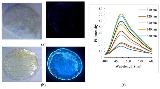 As shown in Figure 7a,b, the PVA film without the immobilization of N–CDs had no PL emission while PVA/N–CDs films exhibited a bright greenish PL under UV-light irradiation. This indicated that the N–CDs were properly encapsulated in the PVA film. The presence of the active hydrogen-containing groups (–COOH, –OH and –NH) on the N–CDs surface could form cross-linking chains. This led to the hydrogen bond formation from their plenty interactions with PVA [92,94]. In contrast to the aqueous N–CDs solution shown in Figure 3c, only an excitation independent feature was observed from the solid film upon various excitation wavelengths (Figure 7c), which is consistent with previous finding [95]. Additionally, the excitation/emission maxima of PVA/N–CDs film was red-shifted by 10/3 nm, respectively (Figure S7). This phenomenon may belong to PVA environment, which was a different case compared to the aqueous solution [96].