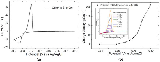 (a) Cyclic voltammetry (CV) of Cd2+ solution on n-Si in sulfuric acid between −0.2 V to −0.9 V, scan rate 10 mV/s; (b) charge density of Cd deposited varying the deposition potential, calculated from the stripping voltammetry (inset) performed between −0.85 V and −0.4 V, scan rate 10 mV/s.
