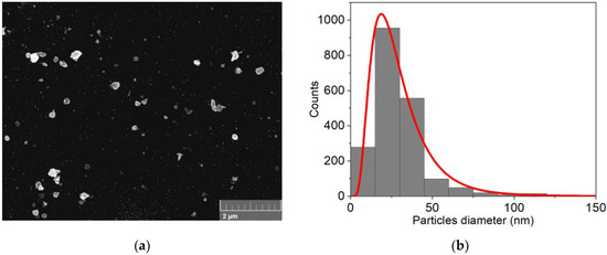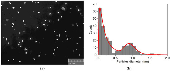 SEM analysis was performed on sample B (Figure 4a and Figure S2). In this case, the deposit was composed of a large spherical particle distribution with a mean diameter of 0.70 ± 0.50 µm. The measured particles distribution is reported in Figure 4b and a low surface coverage (≈8%) was calculated as described for sample A.