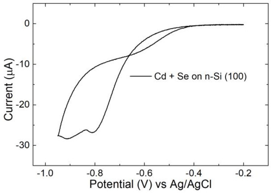 The possibility of the co-deposition process was investigated. We prepared a solution with both Cd2+ 0.1 mM and Se(IV) 0.1 mM in H2SO4 0.1 M. In the resulting cyclic voltammetry on n-Si (Figure 6), the reduction processes started at −0.5 V. Then, two cathodic peaks were present: The first at −0.81 V assigned to the formation of CdSe, and the second at −0.91 V for the reduction of bulk Cd. During the anodic scan, no oxidation peak was detected, suggesting an irreversible process. Even in this case, we observed a cross in the voltammogram due to the overpotential in the deposition on silicon.