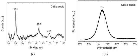 We performed also XRD (Figure 9a) and PL (Figure 9b) characterization on sample E. Since the amount of material was too low to obtain an appreciable signal, samples C and D were not suitable for these measurements. From the XRD analysis, we concluded that the deposit had a sphalerite (cubic zincblende) structure. Indeed, the three typical peaks (111, 220 and 311) of this form were visible. The sphalerite form was not the most stable crystalline structure for CdSe and converted to wurtzite over 130 °C. However, this structure is the typical form obtained from low-temperature aqueous synthesis [48,49]. The PL analysis highlighted an emission at 720 nm due to the presence of CdSe [50].