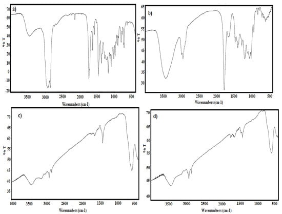 The active functional groups of MAE, OBE and MAE-MNMs and OBE-MNMs are elucidated using FTIR spectra represented in Figure 1a–d. The spectra of MAE and OBE (Figure 1a,b) show strong absorption bands at 3447, 3420 cm−1; 2918, 2970 cm−1; 2850, 2932 cm−1; 1736, 1766 cm−1; and 1629, 1655 cm−1 corresponding to O-H, saturated C-H, C=O, and C=C stretching vibrations. The appearance of new bands of the MNMs spectra at 580 and 583 cm−1 (Figure 1c,d) correspond to the stretching vibrations of Fe-O, which confirms the formation of iron oxide as reported earlier [39].