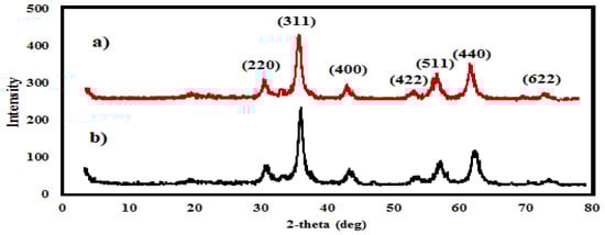 The XRD diffraction patterns of the MAE-MNMs and OBE-MNMs are shown in Figure 2a,b. The appearance of characteristic peaks at 2θ angles 30.14°, 35.91°, 43.21°, 53.73°, 57.27°, 62.51° and 74.79° is associated with the indices 220, 311, 400, 422, 511, 440 and 622, respectively, as indicated in the Figure 2. Compared to the standard peaks [40], it is elucidated that the chemical structure of MNMs is unaffected by the surface modification using the phytoconstituents of MAE and OBE extracts. Additionally, the appearance of a broad peak at 19.11° corresponds to the presence of the extracts and confirms the successful coating of the MNMs [16].
