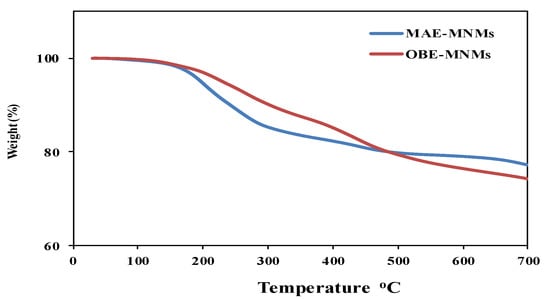 The thermal stability of the formed MNMs was determined using TGA analysis (Figure 3). The initial weight loss of the MAE-MNMs and OBE-MNMs (at temperature increase up to 200 °C) is generally related to the evaporation of physio-adsorbed water or other solvents during the purification process. The degradation of the MAE-MNMs and the OBE-MNMs begins approximately at 200 °C and stops around 500 °C with a total weight loss of approximately 20% and 21%, respectively. Such material loss may be attributed to the decomposition of the MAE and OBE constituents. The magnetite content of the MAE-MNMs and the OBE-MNMs at 700 °C was measured to be 77% and 74%, respectively, suggesting an increase in the total amount of capping agent in the OBE-MNM samples.