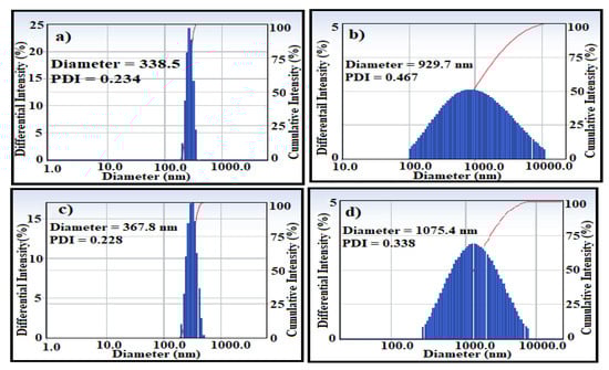 Particle size distribution of magnetite nanomaterials coated by (a) M. aurea extract (MAE-MNMs), (b) M. aurea extract (MAE-MNMs) after 5 cycles, (c) O. baccatus extract (OBE-MNMs), and (d) O. baccatus extract (OBE-MNMs) after 5 cycles in ethanol solvent.