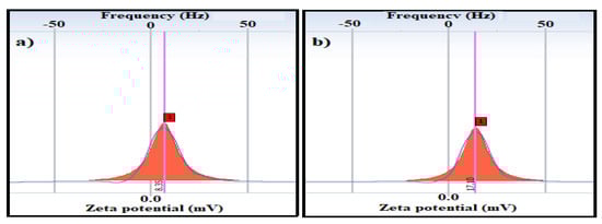 Zeta potential of magnetite nanomaterials coated by (a) M. aurea extract (MAE-MNMs) and (b) O. baccatus extract (OBE-MNMs) in ethanol.