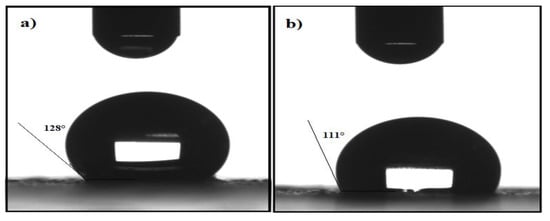 Contact angles of water on magnetite nanomaterials coated by (a) M. aurea extract (MAE-MNMs) and (b) O. baccatus extract (OBE-MNMs).