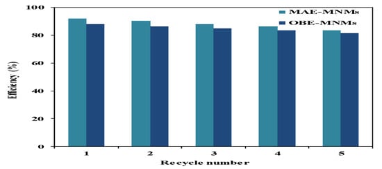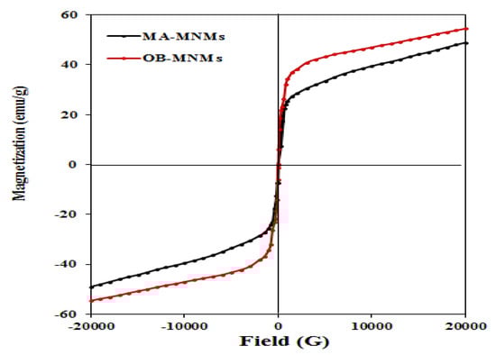 The ability of the prepared MNMs to response for an external magnetic field was evaluated via measuring magnetic properties such as saturation magnetization (Ms), remanent magnetization (Mr) and coercivity (Hc) by VSM magnetic hysteresis loops at 25 °C. Figure 8 elucidates the magnetization of both MAE-MNMs and OBE-MNMs was not saturated even at highest field of (20,000 Oe or 2 T). This can be referred the capping of MAE or OBE on the magnetite surfaces leads to form non-crystalline phase which is responsible for the non-saturation of the hysteresis loop (Figure 8) even at high fields which is termed as high field susceptibility [43]. It indicates the formation of magnetically hard components that can be associated to surface spin disorder [43]. Figure 8 shows absence of hysteresis loops, remanence, or coercivity suggesting that the MAE-MNMs and OBE-MNMs are superparamagnetic materials. At 20,000 Oe, magnetization values of OBE-MNMs and MAE-MNMs are determined to be 55.03 and 48.93 emu/g, respectively, which is enough for the separation of the MNMs by the external magnetic field. Additionally, the increased magnetization value of the OBE-MNMs corresponds to lower amount of capping agents (higher magnetic content) as compared to the MAE-MNMs. This observation was also confirmed by the TGA analysis (Figure 3).