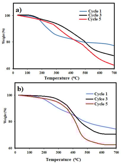 The MNM samples were re-used five times. Each time samples were separated using an external magnet and washed thrice with chloroform followed by an ethanol, air-drying, and direct utilization for the next cycle. A ratio of MNMs to crude oil of 1:10 was chosen to evaluate the ability of the recovered MNMs in the collection of oil spill and their results are represented in Figure 9. It was found that slightly decreasing in their efficiency with an increasing in the number of the reused cycles. This observation can be attributed to increase agglomeration of MNMs and adsorption of some crude oil components such as asphaltene on the MNMs surfaces with each additional cycle. The agglomeration of MNMs and adsorption of the residual crude oil components on their surfaces were confirmed by carrying out both particle sizes measurements and TGA analysis as showed in Figure 5b,d and Figure 10a,b, respectively. It was observed that, the MNMs particles agglomerated after 5 cycles to reflect the adsorption and interaction of crude oil components on their surfaces. TGA thermograms (Figure 10a,b) elucidate that the amount of the remained residual metal oxide above 650 °C decreased with increasing in the number of cycles. Moreover, the TGA thermograms (Figure 10a,b) confirm the increasing of the amount of organics adsorbed molecules on the MNMs surfaces after five cycles when compared with the original MNMs.
