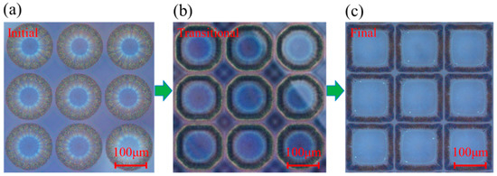 The size of the ring structures was expected to depend on a combination of four factors: the droplet space, the spreading of the solvent on the pre-coating substrate, the evaporation rate of the solvent, and the dissolution rate of the polymer. It is worth noting that the dissolving process is a dynamic process; here, we captured the transformation process of the dynamic process. Figure 2 reveals the dynamic process of fabricated rings array in PVP using silver nanoparticle ink to locally dissolve the polymer material, and the drop space was set to 150 µm. As we can see, Figure 2a presents the initial state of the droplet, the droplet takes the form of a regular circle, and each drop is relatively independent. The ring-like structure formed immediately as soon as the droplet was deposited on the substrate. Because of the radial capillary flow induced by the heterogeneous evaporation, the solute migrated to the edge of the droplet rapidly and resulted in a big hole in the center of the droplet. As time went on, the solvent in the droplet dissolved the substrate and the ring expanded along a radial direction, as shown in Figure 2b. It is worth noting that the holes had a more octagon shape rather than a circle shape. The boundary stopped sliding toward to the radial direction, when the circles were close to each other, but along with the direction of the tangent direction. Finally, regular, homogeneous square microstructures arrays were formed on the substrate with ultrashort channels between each unit, as a typical example shown in Figure 2c.