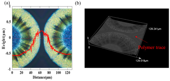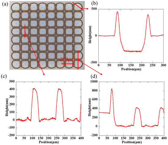 Figure 3a shows an orderly array by inkjet etching and the cross-sectional scanning by a step profiler, and the droplet space is 150 μm. As we can see clearly in Figure 3b–d, the height of the polymer layer is about 300 nm and the height of silver ring is about 400–600 nm. The size of the hole is about 100 μm × 100 μm and the width of the ring is about 20 μm. The peripheral structure of the array was irregular because no barrier limited its outward expansion, so it was deposited as an arc-shaped structure at the periphery and a square shape inside. The bottom of the hole was relatively flat within the resolution of the step profiler, indicating that the solvent in the droplet completely penetrated the polymer layer. However, there still existed few visible residues in the holes from the optical microscopy image, which may be ascribed to residual silver nanoparticles adsorbed by the surface energy. The cross-section indicates regular sharp peaks which separated holes. Furthermore, it is noted that the adjacent holes were not mixed together. The ultrashort channel formed among these microstructures. We can see clearly in Figure 4a that the gap was not a concave shape, but a convex structure. In addition, in Figure 4b, an obvious polymer trace around the deposited ring was founded, which proved that the gap would be filled with the pre-coated polymer.