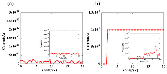 The current as a function of voltage when the probes stabbed at the opposite angles of a single ring: (a) annealing at 200 °C for 30 min, and (b) annealing at 400 °C for 30 min. The drop space is 150 μm. Insets are the shorting tests results between two silver traces.