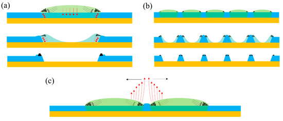 Because the shape of the etched structures always reflects the state of the solute and solvent in the droplet during the etching process, these microstructures are certainly the result of the interaction of adjacent droplets and the substrate. The strong evaporation due to the high surface-to-volume ratio at the edge of the droplet induced the solvent compensation from center to the edge. The dissolution of the PVP promoted the slide of the triple-phase contact line (TCL); the TCL stopped sliding toward to the radial direction without coalescence, but along the direction of the tangent direction. Pasquale et al. thought the repulsion may originate from the rapid evaporation of solvent and the resulting flux of solvent vapor, or from the thermal-gradient-driven Marangoni convection inside the droplets, causing a repulsive air flow between them [19]. Here, we built a simple model to clarify the formation process. Figure 7a,b exhibit the cross-sectional diagrams of the single and multiple droplets deposited on the pre-coated PVP substrate, finally resulting in inerratic microstructures. As soon as the droplet contacted the substrate, the solvent in the droplet dissolved the polymer at the bottom and, along the side direction at the same time, the silver nanoparticles migrated to the edge of the droplet immediately. With the evaporation of the solvent, forming a hole in the center of the droplet, the residual solvent would not stop the erosion until exhausting the solvent. At last, each droplet would turn into a ring-like structure consisting of the solute with a hole in the center and a gap between adjacent rings. In the model as shown in Figure 7c, two dominant factors prevent the droplets from coalescing: One is the repulsive force which originates from the strong opposite evaporation flux at the edge due to the wedge geometry; Another is the accumulated polymer in the channel, which has been proved in Figure 4b.