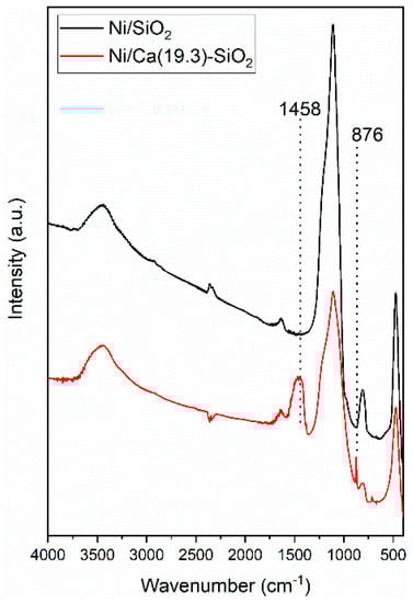 The FTIR spectra of the reduced Ni/SiO2 and Ni/Ca(19.3)-SiO2 catalysts were analyzed (Figure 2). FTIR spectra show a broad band at 3528–3596 cm−1, which corresponds to the stretching vibration mode of the O-H bond from the silanol group (Si-OH). The band at 1050–1080 cm−1 is assigned to the asymmetric stretching vibration of the siloxane bonds (Si-O-Si). The network Si-O-Si symmetric bond stretching vibrations are found at 620–900 cm−1, whereas the network O-Si-O bending vibration modes are observed at 469–481 cm−1. It is noted that the bands decrease in intensity as the content of Ca wt.% increases [20]. For the Ca promoted sample, with 19.3 wt.% of Ca, the broad band at 1458 cm−1, associated with the band at 876 cm−1, is assigned to asymmetric C-O stretch and out-of-plane deformation, respectively, of monodentate carbonate species on the CaO phase [22].