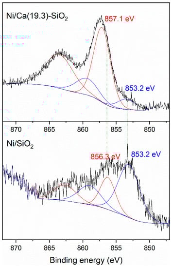 X-ray photoelectron spectroscopy (XPS) spectra of Ni 2p3/2 region of reduced Ni/SiO2 and Ni/Ca(19.3)-SiO2 catalysts.