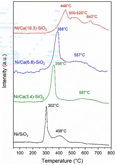 The reducibility of the supported nickel catalysts was studied by temperature-programmed reduction (TPR). TPR is a powerful tool for the study of the reduction behavior of oxidized phase, as NiO, and obtainment of the strength of the oxide-support interaction. Figure 4 shows the TPR profiles of the catalysts, where two main reduction peaks can be observed. Peaks in the 200–300 °C range that are attributed to the reduction of superficial oxygen [11] are not detected in these solids. Peaks above 300 °C represent reductions in Ni(II) species with different interactions with the support. Peaks between 300 °C and 600 °C can be attributed to Ni(II) species with low support interaction, as NiO. Due to high mobility, this Ni(II) phase can be easily reduced and shows a low reduction temperature. Peaks above 600 °C refer to Ni(II) with moderate/strong support interaction [26]. Reduction peaks at higher temperatures appear as Ca is added, which suggests this addition increases the interaction of Ni(II) with the support. The reduction temperature increased with the Ca loading. These results are consistent with those observed by XPS experiments.