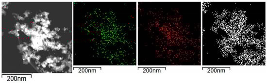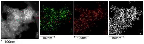 Figure 13 shows the images obtained in the STEM mode and the EDX mapping of nickel (green), calcium (red), and silicon (white) revealed that Ni and CaO particles are evenly distributed on SiO2 and coincide in occupying the same space on the support.
