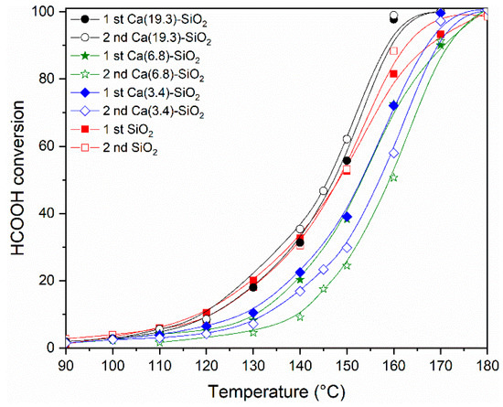 Figure 7 shows the conversion of formic acid as a function of the reaction temperature for the series of Ni catalysts. The light-off curves were made following the same procedure in all the samples. After the reduction of the catalytic material, it was cooled in N2 flux to 60 °C, and then the reaction mixture was fed with a concentration of HCOOH of 6% in N2. After the curve measured from 0% to 100% (1st evaluation—Figure 7), the temperature was lowered to leave it in isothermal conditions and to measure the stability of the samples (Figure 8). After 16 h of reaction, the temperature was lowered and the complete curve was again measured from 0% to 100% (2nd evaluation in Figure 7) of the light off curve. The behavior throughout the conversion range shows the same tendency observed in Table 1. The catalysts were relatively stable under the conditions tested, although it can be observed that the points corresponding to the 2nd evaluation are below those obtained in the 1st, probably due to a restructuring of the material at the temperature reached (160–180 °C) and with conversion values close to 100%. In the Ca(19.3)-SiO2 catalyst, this behavior is less marked.