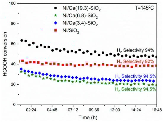 The Ni/SiO2 catalyst reached 50% of formic acid conversion at a temperature of 148 °C and 100% at 180 °C, while the selectivity was 91% and 87%, respectively. For the catalysts supported on binary systems, the selectivity was higher in all cases. It is important to note that the catalyst with the highest Ca content (19.3 wt.%) reached 100% conversion at 160 °C, this being 20 °C lower than that of the undoped one. The doping with Ca modified the interaction of the metal with the support and the Ni particles remained stable during the catalytic test. However, for Ni/SiO2 catalyst the distribution and average particle size are doubled during reaction with respect to those of the reduced sample. The stability in the average size of the nickel particles in the used Ni/Ca(19.3)-SiO2 catalyst could explain the difference in the behavior of this material to the others. Moreover, this catalyst was relatively stable under the reaction conditions used, presenting an equal performance in two sequential catalytic tests.