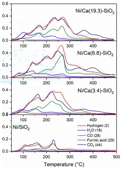 There are two regions marked on the profiles: the first part corresponds to the decomposition of formic acid (up to 180 °C), and the second part corresponds to the decomposition of surface or mass species (formates, bicarbonates, and carbonates). The second part is closely related to the basic component of the catalyst. These samples doped with Ca present the H2 and CO2 desorption at a higher temperature. This could indicate greater stability of the species, for example, formate or bicarbonate species, which store hydrogen.