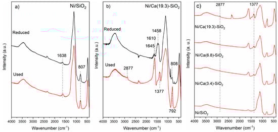 The FTIR spectra of the used Ni catalysts were analyzed (Figure 10). Figure 10a shows FTIR spectrum of used Ni/SiO2 catalysts; the reduced one was included for comparison. It can be clearly observed that the spectra are identical before and after the catalytic test, and the signals described above are present. Figure 10b shows the spectrum of used Ni/Ca(19.3)-SiO2 catalysts; the reduced one was included for comparison.
