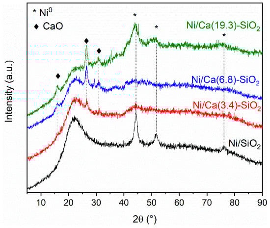 Figure 11 shows the diffractograms obtained for the used Ni/SiO2 and Ni/Ca-SiO2 catalysts. The characteristic diffraction broad peak centered on 2θ = 23° confirmed the amorphous nature of the SiO2 support. After reaction experiments, the diffraction patterns obtained for the Ca(X)-SiO2 supported catalysts exhibit reflections from CaO species centered at 15.8°, 26.5°, and 30.7° [11]. The used Ni/Ca(19.3)-SiO2 catalyst, as well as the reduced one, present broad peaks assigned to Ni species, indicating the presence of both metallic and oxidizes Ni particles. This result is consistent with those observed through TPR and XPS experiments. For Ni/SiO2 catalyst, the peaks at 44.3°, 51.7°, and 76.2° are assigned to metallic Ni particles. Comparison with the fresh reduced samples (Figure 1) reveals that, in the case of the Ni/SiO2 sample, the reflections corresponding to Ni0 became sharper, which suggest that, in the absence of the Ca promoter, nickel is affected by the reaction conditions.