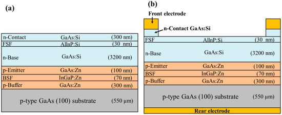 As shown in Figure 1a, the epitaxial layer structure in the GaAs single-junction solar cell was grown using metal-organic chemical vapor deposition (MOCVD) on a p+-GaAs (100) substrate. Arsine (AsH3) and phosphine (PH3) were used as group-V source gases, whereas trimethyl-Gallium (TMG), trimethyl-Indium (TMI), and trimethyl-Aluminum (TMA) were used as group III precursors. Disilane and dimethyl-zinc (DEZ) were used for n- and p-type doping, respectively. Growth was conducted over a temperature range of 635 to 650 °C under a chamber pressure of 15 mbar. First, a 300 nm thick p-GaAs (5 × 1017 cm−3) buffer layer was grown on the p+-GaAs substrate. This was followed by a 70 nm thick p-InGaP (5 × 1017 cm−3) back surface field (BSF) layer, a 100 nm thick p-GaAs (5 × 1017 cm−3) emitter layer, a 3200 nm thick n-GaAs (1 × 1015 cm−3) base layer, a 30 nm thick n-AlInP (5 × 1017 cm−3) front surface field (FSF) layer, and a 300 nm thick n+-GaAs (5 × 1018 cm−3) contact layer. The quality of the epitaxial layers was confirmed using double crystal X-ray diffraction, photoluminescence, scanning electron microscopy, and electrochemical capacitance-voltage measurements. The epitaxial layer structure of the proposed GaAs single-junction solar cell was grown using MOCVD and evaluated prior to device processing by a commercial epi foundry, WIN Semiconductors Corp.