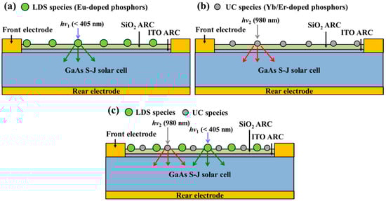 Single-junction solar cells only convert photons with energy equal to and above the bandgap of the active material in the solar cells. Photons carrying energy below the bandgap (Eg) are not absorbed at all, i.e., their energy is not used for the generation of photocarriers. Almost all photons with energy exceeding the bandgap are absorbed, however, the excess energy (>>Eg) is lost due to thermalization of the photocarriers they generate. The spectral losses of single-junction solar cells (e.g., silicon and GaAs) limit the theoretical photovoltaic efficiency to about 30% to 33% [1,2,3]. The mismatch between the incident solar energy spectrum and the spectral absorption of solar cell is a crucial issue [4,5,6]. Considerable effort has gone into the creation of high-efficiency single-junction solar cells by overcoming the conversion efficiency limit. This has led to the development of multiple bandgap tandem cells [7,8,9,10,11], intermediate bandgap cells [12,13,14], down-conversion (DC) cells [15,16,17,18,19,20], up-conversion (UC) cells [21,22,23,24,25,26], and luminescent downshifting (LDS) cells [27,28,29,30]. In recent years, luminescent-phosphors materials for DC, UC, and LDS, which are capable of converting a broad spectrum of light into photons of particular wavelengths, have been synthesized and used to minimize the losses in the photovoltaic device energy conversion process. The spectral conversion layer of DC and LDS cells is generally located on the top surface of the cell, as it is meant to convert ultraviolent (UV) photons (E >> Eg) into visible (green-rich, red-rich) photons. The spectral conversion layer of UC cells is generally located on the bottom side of solar cells, as it is meant to modify photons that are not absorbed by the solar cell by shifting IR (infrared) and NIR (near infrared) parts of the spectrum to the visible part. Extensive research has been done to study spectral conversion on silicon-based solar cells, which has involved applying a DC-layer, or LDS-layer, to the front side of silicon-based solar cells, however, few researchers have applied a UC-layer to the front side of GaAs single-junction solar cells [31,32,33,34,35,36]. Furthermore, few researchers have simultaneously applied LDS-phosphors and UC-phosphors on the front side to enhance the conversion efficiency of GaAs single-junction solar cells.