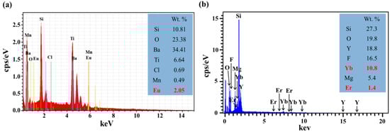 EDS can be used effectively for element analysis. Each element within a sample possesses a unique atomic structure, which exhibits a unique set of peaks in its electromagnetic emission spectrum. Figure 4a shows the EDS spectrum of a silicon substrate coated with a SiO2 layer containing Eu-doped silicate phosphors composed primarily of Ba, O, Si, and Ti with small quantities of Eu, Cl, and Mn. Figure 4b shows the EDS spectrum of a silicon substrate coated with a SiO2 layer containing Yb/Er-doped Y2O3 phosphors composed primarily of Si, O, Y, and F with small quantities of Yb, Mg, and Er. The Y2O3-material features a high melting point, wide bandgap, high solubility between Yb3+ and Er3+, and good transparency at ultraviolet and infrared wavelengths.