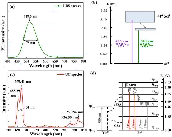 (a,c) PL fluorescence emission spectrum and (b,d) the energy level scheme from silicon substrate coated with a SiO2 layer containing of Eu-doped silicate phosphors under excitation at a wavelength of 405 nm and Yb/Er-doped phosphors under excitation at a wavelength of 980 nm, respectively.