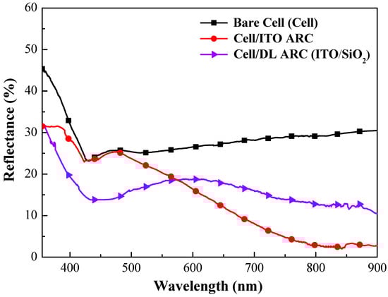Figure 7 presents the optical reflectance spectra of bare-type GaAs single-junction solar cells and GaAs solar cells coated with an antireflection layer of ITO or ITO and SiO2 (refer to Figure 2a,b). Table 1 lists the weighted reflectance (Rw) calculated over a wavelength range of 350 nm to 900 nm. For the sake of clarity, the RW and EQEW values of proposed cells were calculated as follows: