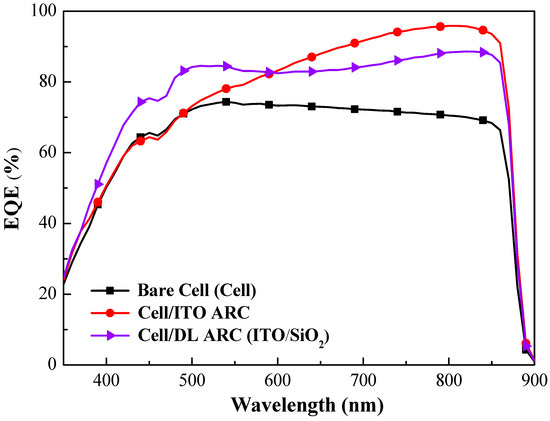 where EQE(λ) is the external quantum efficiency at a given wavelength (λ) and ϕph(λ) is the photon flux of AM 1.5 G at that wavelength (λ). The ITO layer increased the EQE values between 450 nm and 900 nm wavelengths and layers of ITO/SiO2 increased the EQE values between 350 nm and 900 nm wavelengths, which were consistent with the obtained changes in optical reflectance. The overall EQEw of the GaAs solar cell with layers of ITO/SiO2 (77.15%) slightly exceeded that of the GaAs solar cell with an ITO layer (76.64%).
