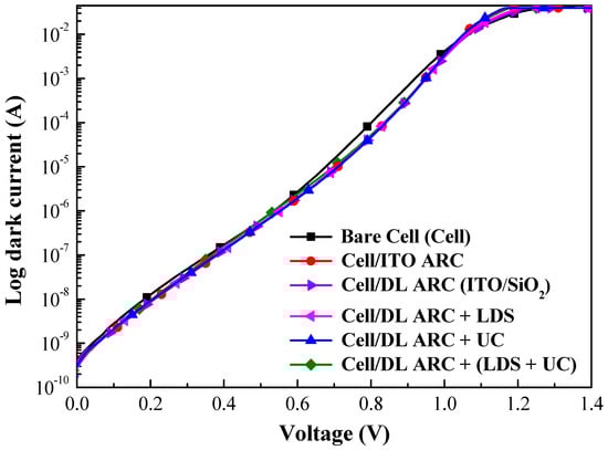Figure 9 presents the dark I-V curves of a bare-type GaAs single-junction solar cell and GaAs solar cells coated with a layer of ITO or layers of ITO/SiO2, or GaAs solar cells coated with a SiO2 layer containing various phosphor particles. The ideality factor (n) and reverse saturation current density (J0) of the proposed GaAs solar cells are listed in Table 2. The n and J0 values were as follows: bare-type GaAs solar cell (2.12 and 5.04 × 10−11 A/cm2), ITO-coated GaAs solar cell (1.84 and 2.20 × 10−12 A/cm2), ITO/SiO2-coated GaAs solar cell (1.77 and 1.15 × 10−12 A/cm2), and the cells with a SiO2 layer containing Eu-doped phosphor particles (1.77 and 1.15 × 10−12 A/cm2). In this study, the passivation effects of the ITO layer, the ITO/SiO2 layer, or the SiO2 layer containing Eu-doped phosphor, on GaAs in suppressing surface recombination were found to be reduced for n and J0, as compared with that of the bare cells. In addition, the n and J0 values can be extracted from Log current versus voltage (Log I-V) curves by drawing an extended straight line along the I-V curves at the voltage between 0.8 V and 1.05 V, the intercept of the current axis by the straight line is the J0 value (or I0/A, A is active area of the diode) and the inverse slope of the straight line is proportional to the ideality factor, n [37].