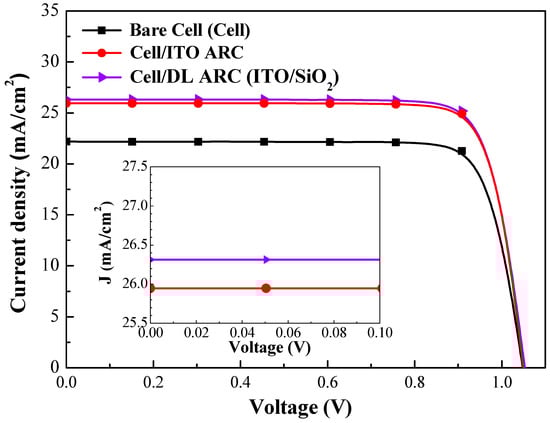 Photovoltaic J-V curves of a bare-type GaAs single-junction solar cell and cells coated with layer of ITO or ITO/SiO2.