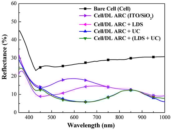 Optical reflectance spectra of bare-type GaAs single-junction solar cell (hereafter referred to as cell), cell/DL-ARC, cell/DL-ARC + LDS, cell/DL-ARC + UC, and cell/DL-ARC + (LDS + UC).