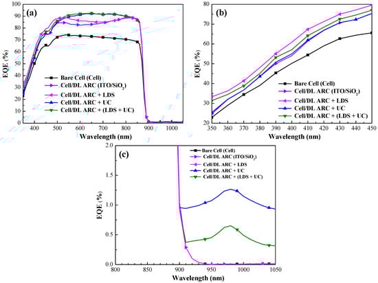 (a) EQE response of bare-type GaAs single-junction solar cell (cell), cell/DL-ARC (ITO/SiO2), cell/DL-ARC + LDS, cell/DL-ARC + UC, and cell/DL-ARC + (LDS + UC); (b) EQE response due to LDS effect at short wavelength region; and (c) EQE response due to UC effect at long wavelength region.
