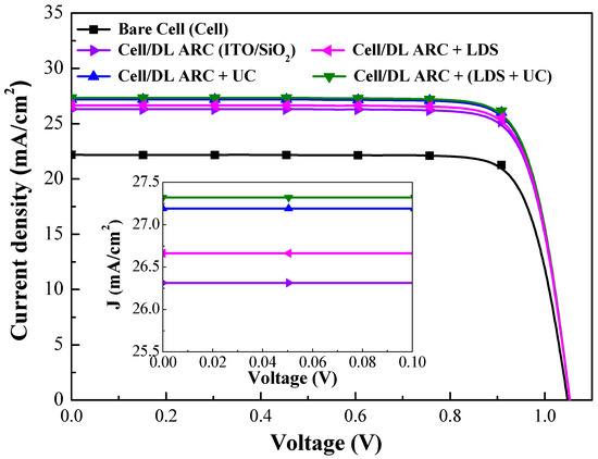 Photovoltaic J-V curves of bare-type GaAs single-junction solar cell (cell), cell/DL-ARC, cell/DL-ARC + LDS, cell/DL-ARC + UC, and cell/DL-ARC + (LDS + UC).