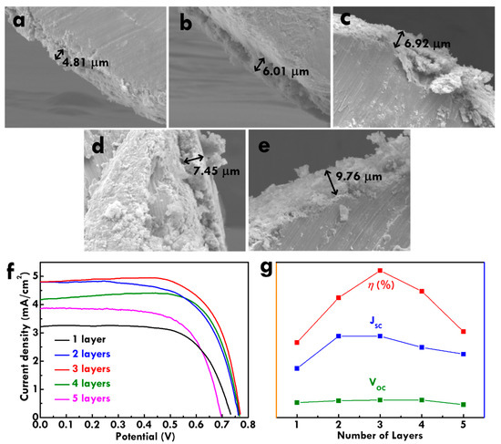 The SEM images for the TiO2 nanoparticles (TNP)/Ti wire prepared using (a) one, (b) two, (c) three, (d) four, and (e) five layers; (f) the linear sweep voltammetry (LSV) curves and (g) the relation of the photovoltaic parameters to the number of TNP layers for the fiber-type dye-sensitized solar cells (FDSSCs) with the TNP/Ti wire photoanodes prepared using different TNP layers.