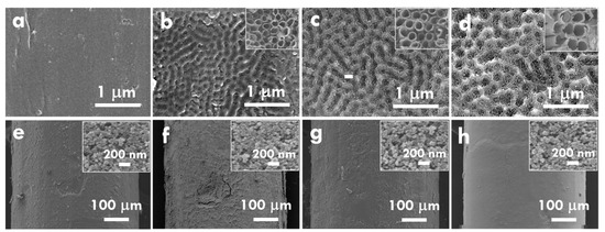 SEM images for Ti wires and TNP-coated Ti wires were examined, as shown in Figure 2. Figure 2a–d respectively presents the as-obtained Ti wire and the pretreated Ti wires using anodization voltages of 30, 40, and 50 V. The SEM images for the anodized Ti wire without the TNT removed were inserted in the corresponding figure in Figure 2b–d. The as-obtained Ti wire shows a smooth surface with some randomly distributed scratches on surface. The Ti wires treated using the TNT growth and removal process with different anodization voltages show uniform circular inks on the surface. Since the TNT has circular open ends, the removal of TNT would leave circular shapes on the Ti wire. Hence, the term “circular inks” was used to describe the remaining shapes on the Ti wire. The diameter of the circular inks on the Ti wire surface increased when higher anodization voltages were applied in the TNT growing process. The average diameter of 91.0, 136.5, and 182.3 nm were respectively obtained for the circular inks on Ti wire surface prepared using 30, 40, and 50 V for anodization. The size of circular inks is inferred to be similar to that of the TNT grown on Ti wire. Furthermore, SEM images of TNP/Ti wires with substrate of the as-obtained Ti wire and the pretreated Ti wires using anodization voltages of 30, 40, and 50 V are shown in Figure 2e–h. The high magnifications for the SEM images are shown in the corresponding figures. Due to the TNP coating, all electrodes show similar images with several nanoparticles distributed. Based on the similar thickness of TNP layers prepared using the same dip-coating process, different Ti wire substrates are inferred to mainly influence the contact between substrate and TNP layer coated on surface of Ti wire. The influence of the Ti wire surface configuration on charge transfer in the TNP layer far from substrate is considered to be limited.